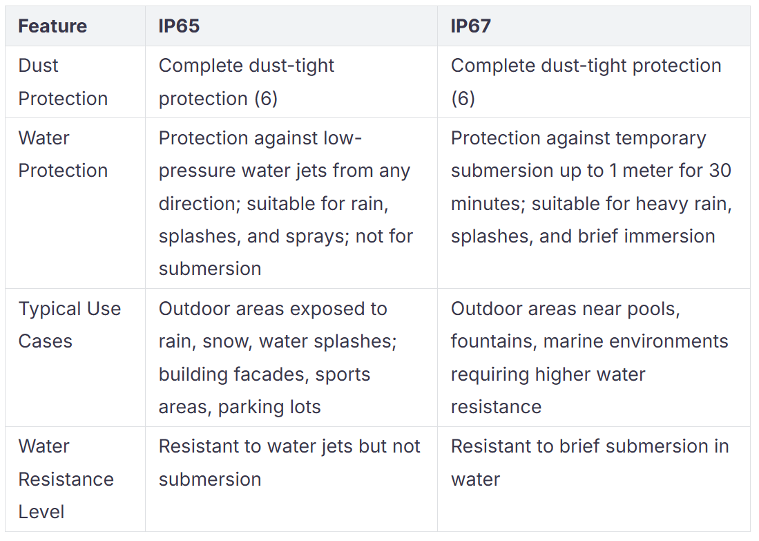 İpucu: Cənnətdə və ya piyada yollarında LED mənzərə işıqlandırması üçün ən azı IP65 ilə suya davamlı armaturlardan istifadə edin. Docks və ya hovuz sahələri üçün ən yaxşı su müqaviməti üçün IP67 seçin.