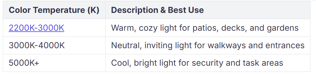 Doğru rəng istiliyini seçmək məkanınızın necə hiss etdiyini və işlədiyini dəyişir. İsti işıq, 2200k-dən 3000 kq-a qədər, yerləri rahat və qonaqpərvər edir. Bunu istirahət etmək və ya dostlarınızla əylənmək istədiyiniz və ya əylənmək istədiyiniz yerlər, göyərtələr və ya bağlar üçün istifadə edin. Neytral ağ, 3000k və 4000k arasında, çox parlaq olmayan aydın işıq verir. Bu, yollarınızı incitmədən yaxşı görə biləcəyiniz üçün bu, yol və giriş üçün yaxşıdır. Sərin ağ, 5000k-dən yuxarı, çox parlaq və kəskindir. Bunu təhlükəsizlik işıqlandırması və ya yerləri aydın şəkildə görmək lazım olan yerlər üçün istifadə edin.