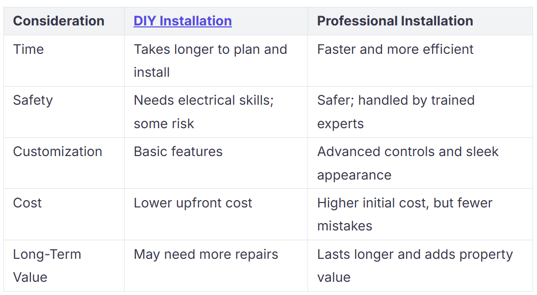 Professional xərcləri daha çox almaq, lakin sizə mütəxəssis köməyi verir. Peşəkarlar yaxşı materiallardan istifadə edir və işıqlarınızın təhlükəsiz olduğundan əmin olun. Çətin iş edə və xüsusi xüsusiyyətlər əlavə edə bilərlər.