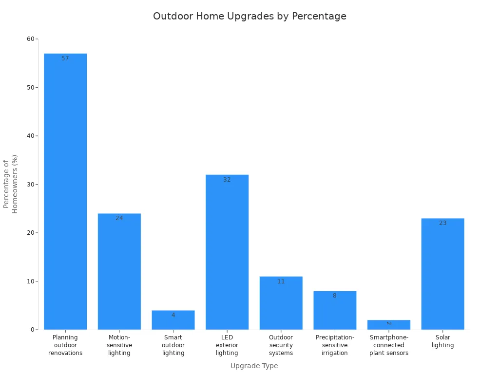 Həyətinizi maraqlı etmək üçün birdən çox növ açıq LED işığından istifadə edə bilərsiniz. Fərqli işıqları qarışdırmaq sizə yaxşı görməyə və məkanınızı yaxşı hala gətirməyə kömək edir. İndi bir çox insan stil və asan istifadə üçün hava keçirməyən, günəş və ya ağıllı qurğular seçir.