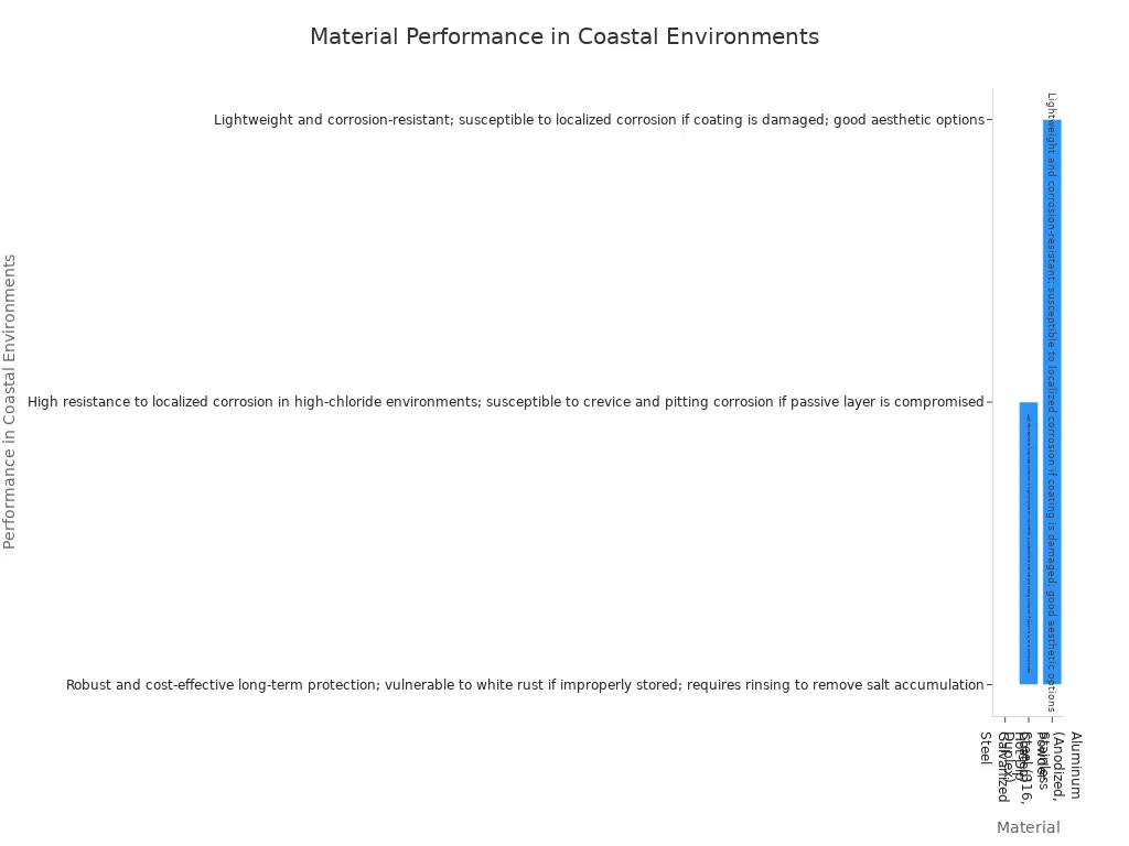 İstehsalçılar daha uzun müddət davam etmək üçün toz palto bitkiləri və möhürlənmiş örtüklərdən istifadə edirlər. Bu xüsusiyyətlər LED Hava keçirməyən işıqlandırma, yaş havalarını, yaş havaya və duz spreyinə kömək edir. Aşağıdakı cədvəldəki dənizin yaxınlığında nə qədər fərqli materialların necə işlədiyini görə bilərsiniz: