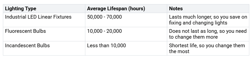 Sənaye xətti işıqlandırma çox sərt və uzun müddət davam edir. LED qurğular digər ampullərdən daha uzun müddət davam edir. Ən çox sənaye LED xətti qurğular sonuncu50,000 ilə 70.000 saat.Floresan ampüller cəmi 10.000 ilə 20.000 saat davam edir. Közərmə ampülləri 10.000 saatdan azdır. Bu, vaxt və pula qənaət edən, onları tez-tez dəyişdirmək məcburiyyətində deyilsiniz.