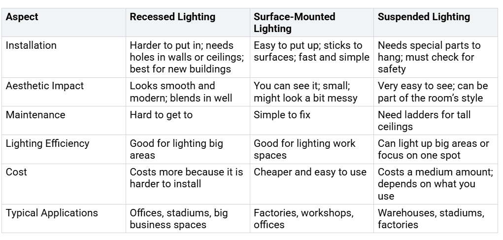 Xətti işıqlandırma bir neçə əsas növ gəlir. Hər növ müxtəlif yerlər və ehtiyaclar üçün ən yaxşı işləyir. Üç əsas növ səthə quraşdırılmış, resessed və dayandırılmışdır. Hər birinin iş yerləri üçün öz yaxşı məqamları var.